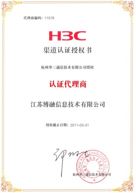 目前,我公司技术人员参加了H3C组织的网络产品及技术培训,并通过了H3C的认证工程师考试。同时江苏博融信息技术有限公司获得了H3C公司颁发的“认证代理商”证书。